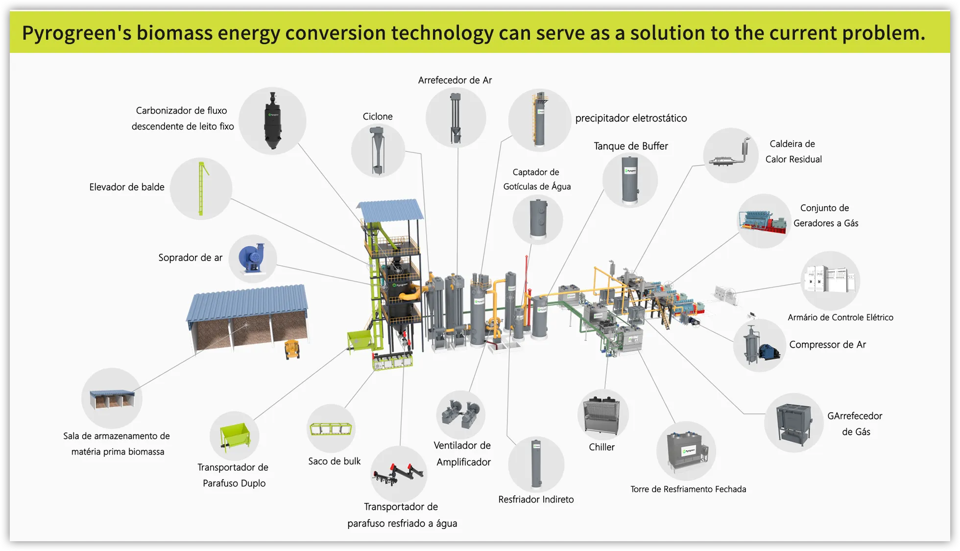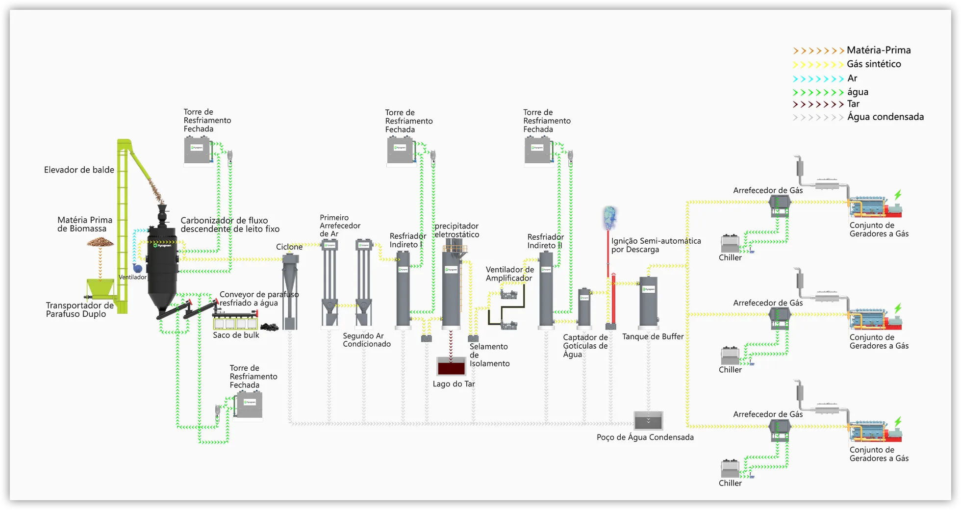 Resíduos agrícolas e florestais, como cavacos de madeira, fardos de palha, cavacos de bambu, sabugo de milho, casca de coco, combustível de pellets de biomassa e outras biomassas, sofrem reação de gaseificação por pirólise no gaseificador com fornecimento de oxigênio pobre, produzindo gás combustível e biochar. Em seguida, é usado como combustível em motor a gás para gerar eletricidade. O biochar é usado em nossa vida diária, produção industrial e agrícola.