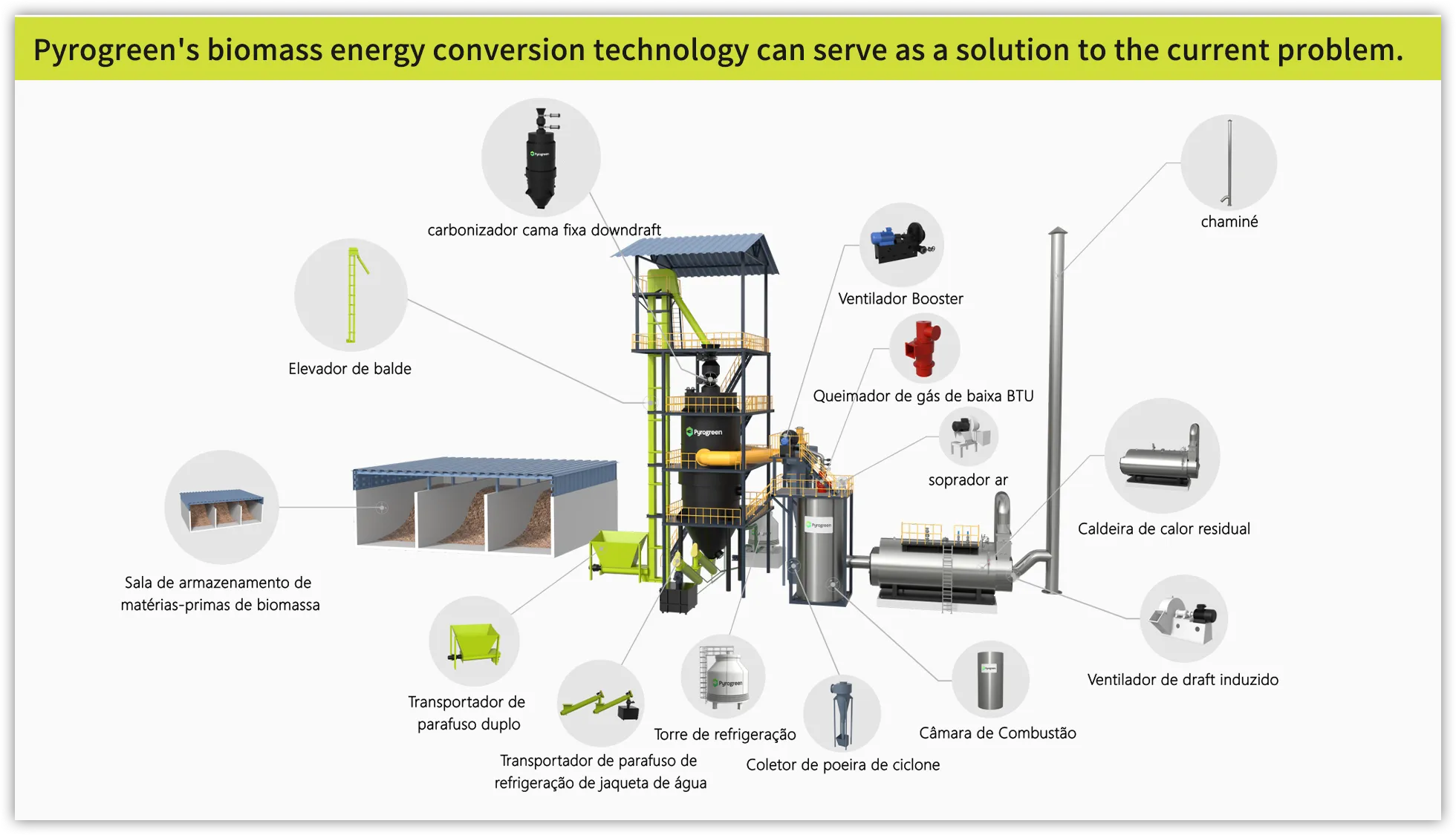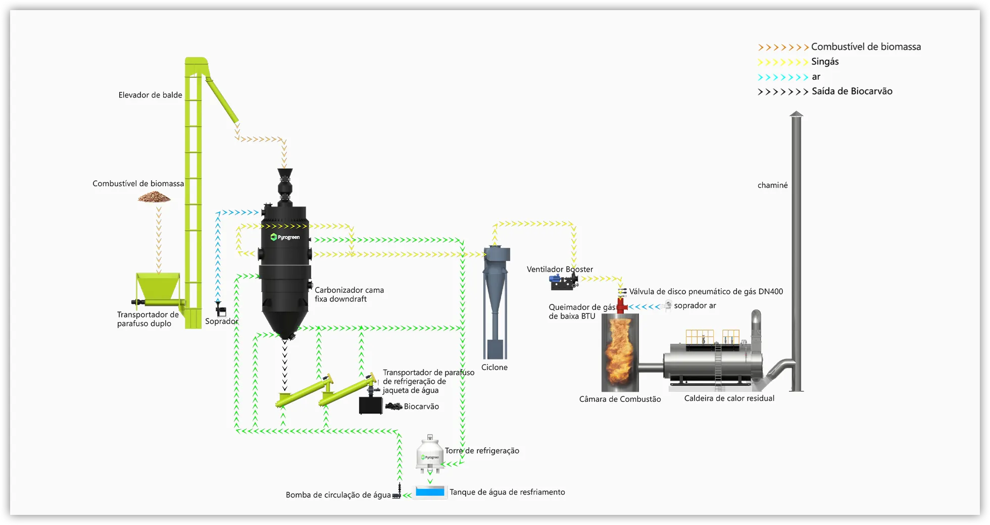 Resíduos agrícolas e florestais, como cavacos de madeira, blocos de palha, cavacos de bambu, sabugo de milho, casca de coco, combustível de pellets de biomassa e outras biomassas, sofrem reação de pirólise e gaseificação no gaseificador com fornecimento de oxigênio pobre, produzindo gás combustível e biochar. O gás combustível convertido da biomassa é diretamente canalizado e queimado no forno adiabático para produzir gases de combustão quentes, cujo calor é trocado em uma caldeira de recuperação de calor para produzir vapor (água quente) para uso residencial ou industrial. O biochar é usado em nossa vida diária, produção industrial e agrícola.
