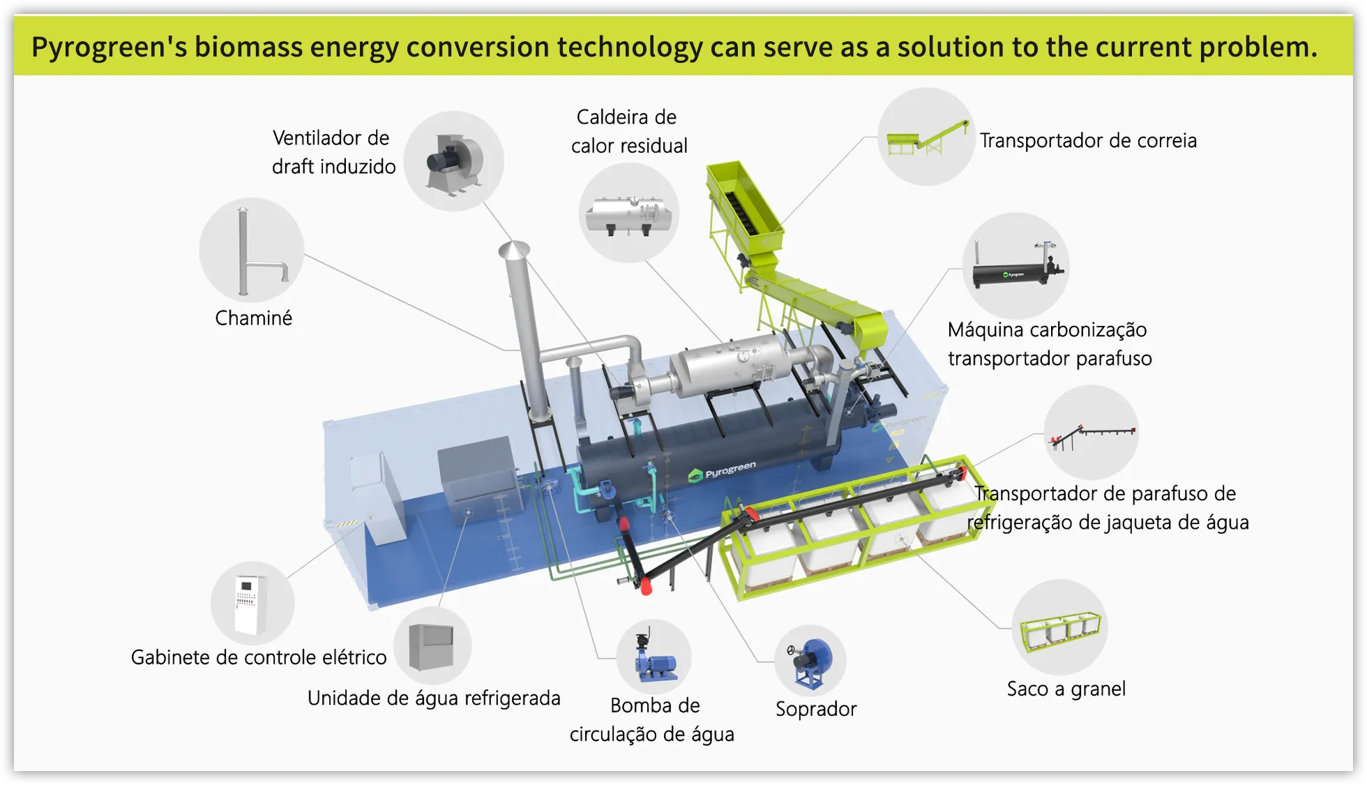 Como líder em sistemas avançados de processamento termoquímico, a Pyrogreen fornece sistemas personalizados de carbonização/torrefação do tipo forno rotativo e tipo parafuso para a produção de biochar a partir de diferentes tipos de biomassa. Às vezes referida como torrefação, a pirólise da biomassa em um produto de biochar de alta qualidade é um empreendimento técnico, exigindo conhecimento avançado dos princípios de processamento termoquímico. Os especialistas em processos da Pyrogreen trabalhariam com você para projetar esse sistema em torno de sua fonte única de material.